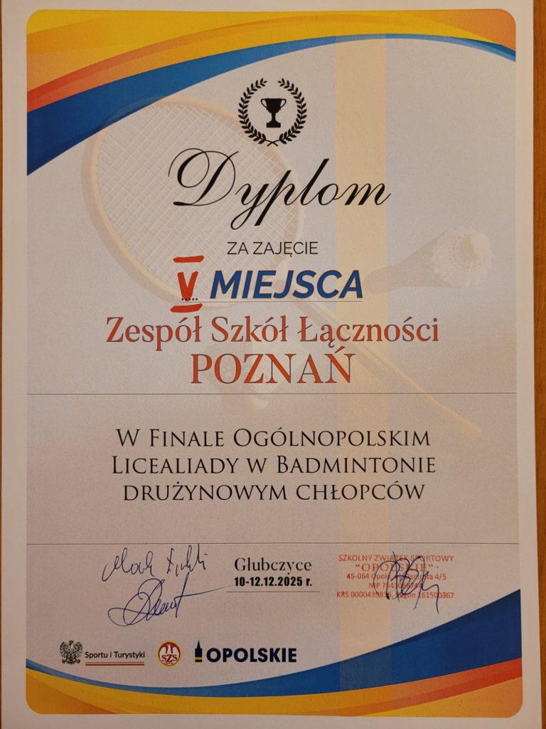 Z dumą i radością informujemy, że reprezentacja Zespołu Szkół Łączności w składzie: Marcin Dymowski 3p1t, Matvii Sydorenko 1pt i Filip Komiński 4et zajęła 5 miejsce w Finale Ogólnopolskim Licealiady w Drużynowym Badmintonie.