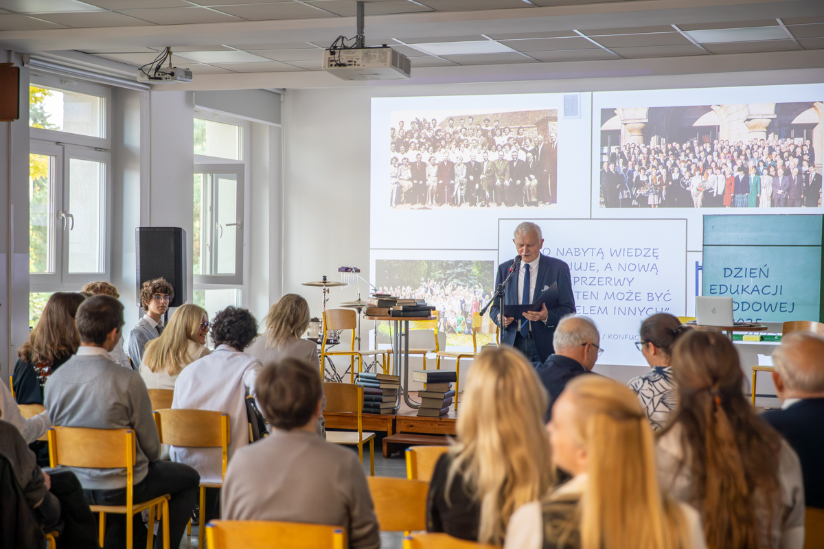 Uroczystość rozpoczęła się od wystąpienia Pana Dyrektora Jerzego Małeckiego, który podkreślił rolę nauczyciela w życiu młodego człowieka oraz złożył serdeczne życzenia całemu gronu pedagogicznemu. Następnie głos zabrała przedstawicielka Rady Rodziców, Pani Żaneta Łukasik, dziękując nauczycielom za ich cierpliwość, troskę i pasję w przekazywaniu wiedzy. Wśród zaproszonych gości znalazła się również Radna Miasta Poznania, Pani Halina Owsianna, która w swoim przemówieniu złożyła ciepłe życzenia wszystkim pracownikom szkoły, podkreślając znaczenie ich pracy i wpływ, jaki wywierają na rozwój młodego pokolenia.