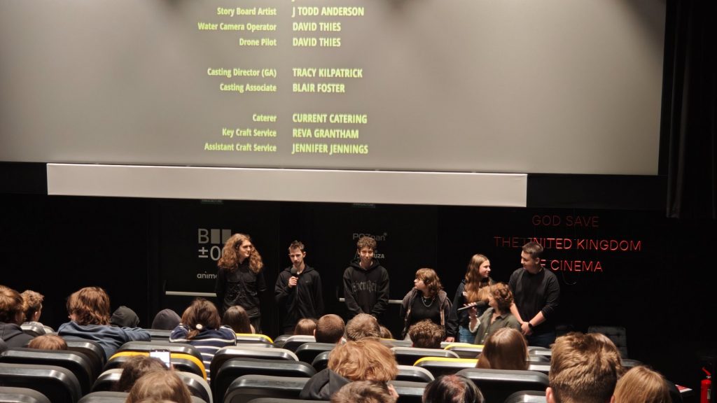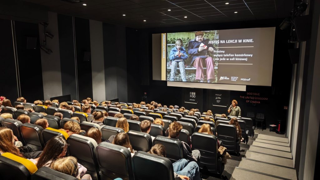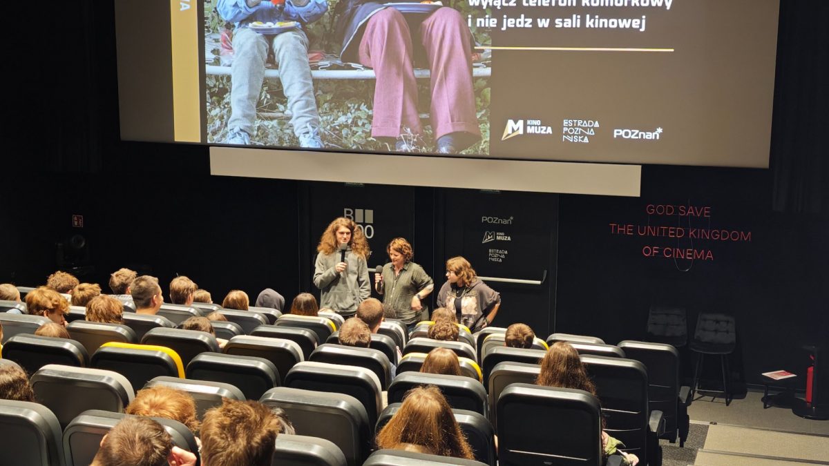 Na zdjęciach – klasa 1P podczas prelekcji przed filmem „Sokół z masłem orzechowym”.