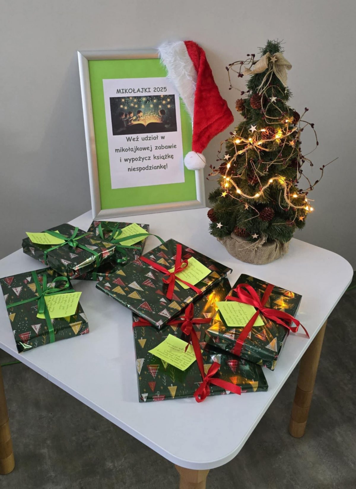 Z okazji Mikołajek przygotowaliśmy wyjątkową atrakcję. W naszej bibliotece czekają specjalnie zapakowane książki – niespodzianki. Każda z nich została starannie owinięta i opatrzona jedynie krótką wskazówką dotyczącą klimatu lub tematyki, bez ujawniania tytułu.