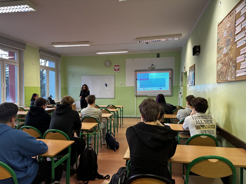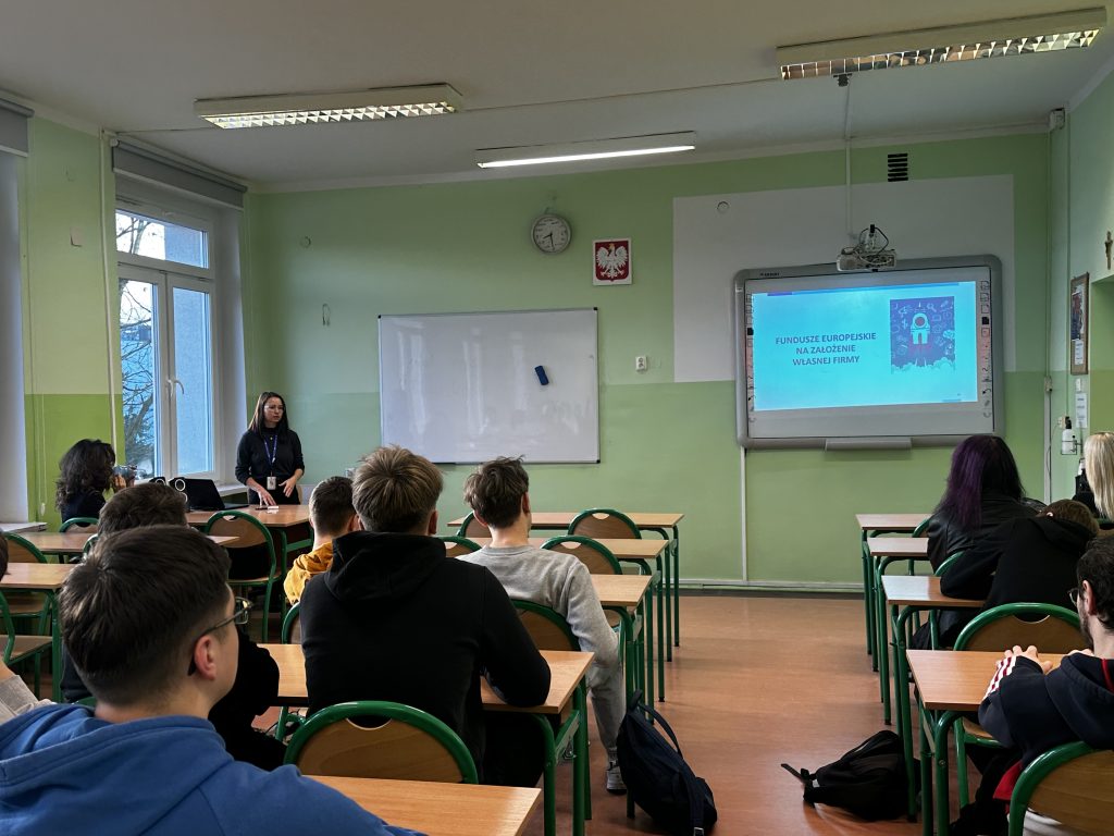 Dnia 21 listopada 2025 r. w naszej szkole odbyła się specjalna lekcja dla klasy 4TT, zorganizowana we współpracy z Punktem Informacyjnym Funduszy Europejskich w Poznaniu, działającym w strukturach Urzędu Marszałkowskiego Województwa Wielkopolskiego.