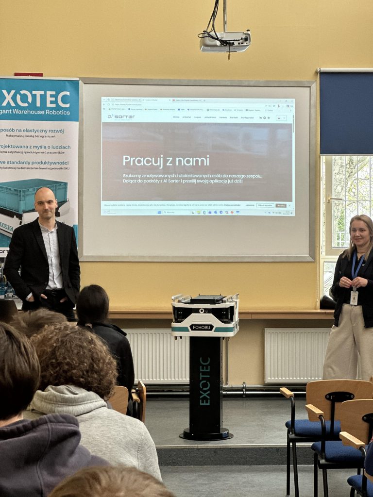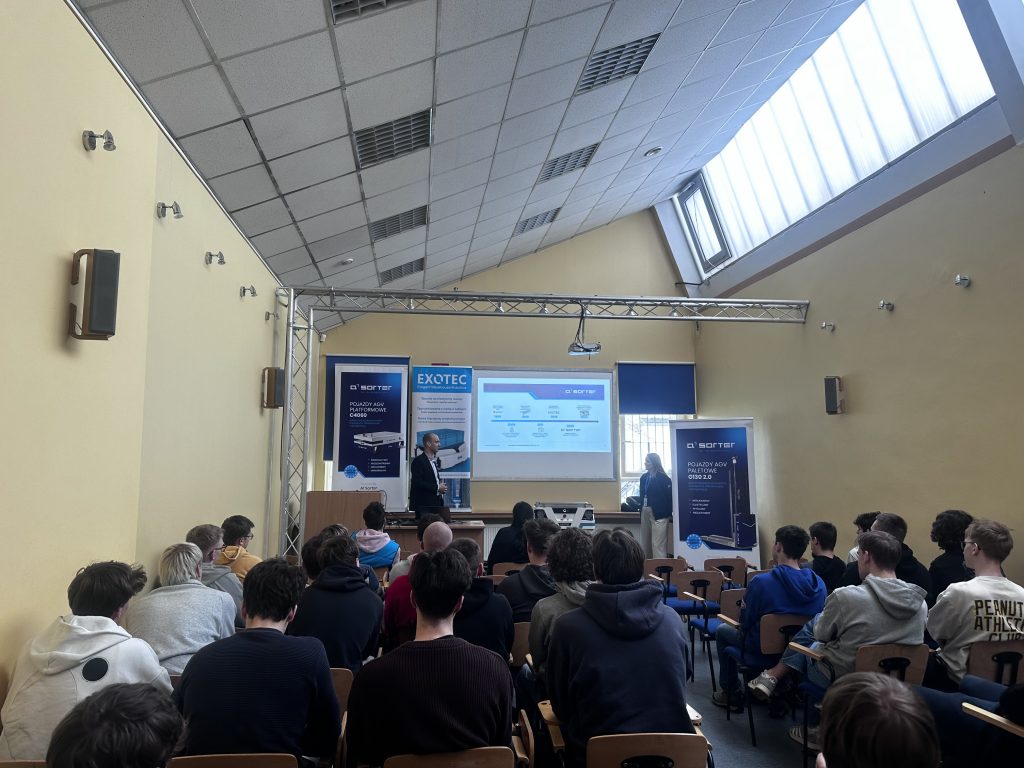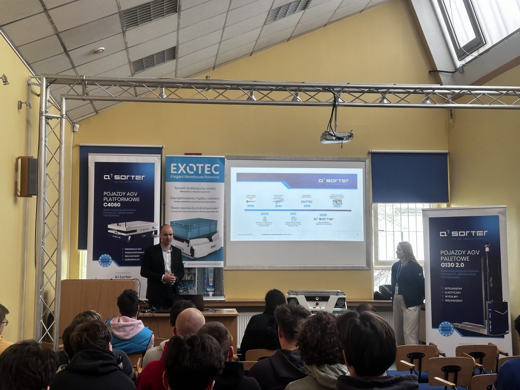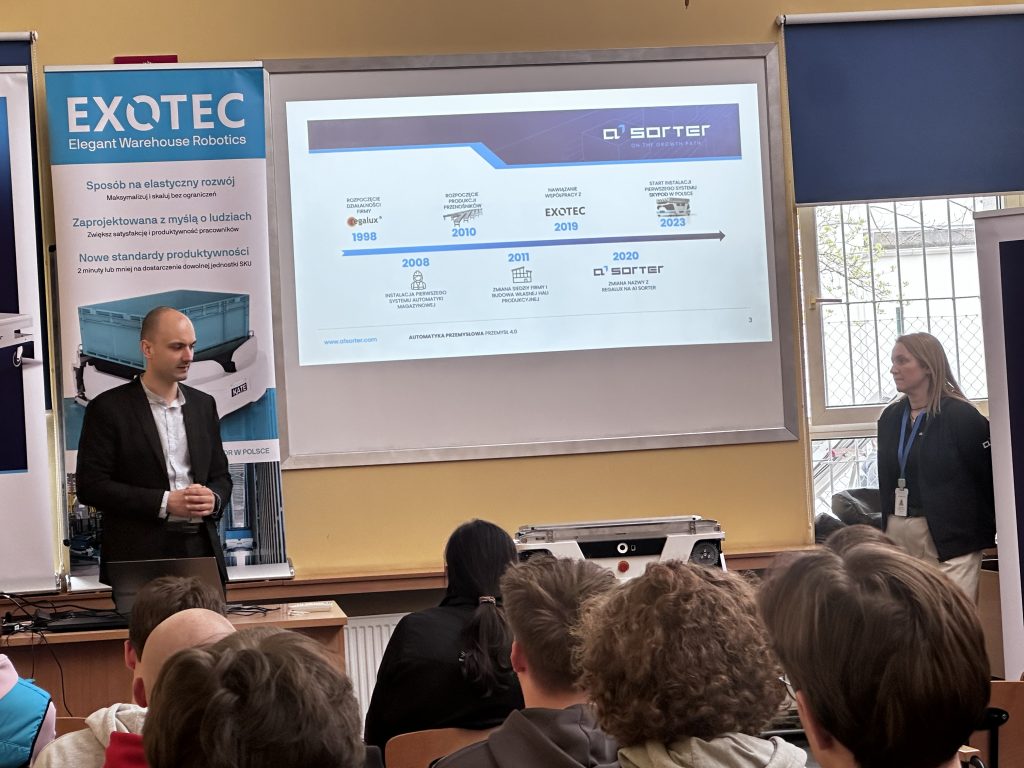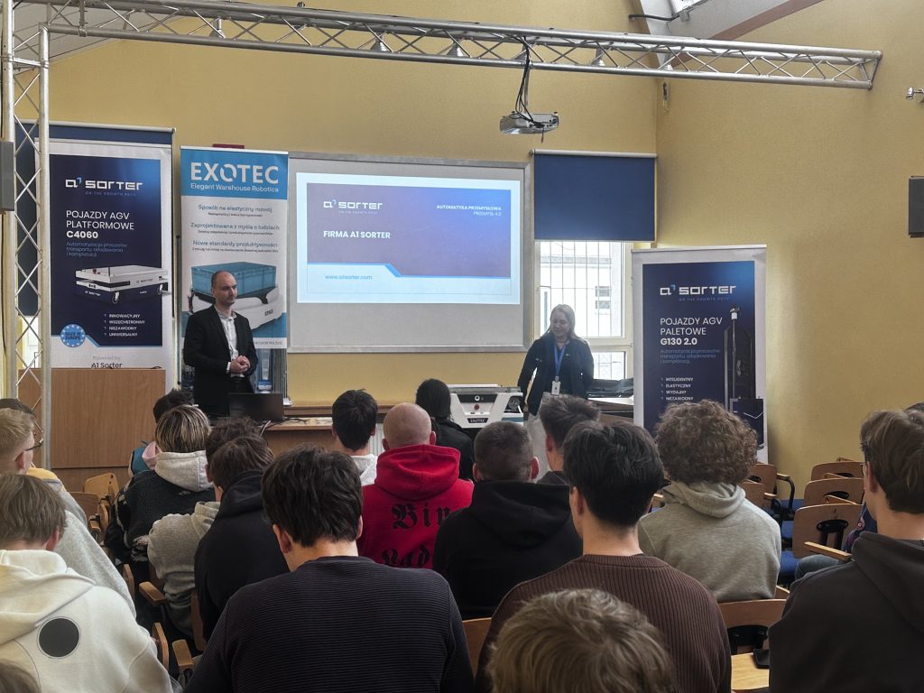 W naszej szkole odbyło się wyjątkowe spotkanie z przedstawicielami firmy A1 Sorter, Panią Katarzyną Szycą oraz Panem Damianem Borzyszkowskim. Goście odwiedzili uczniów, aby przybliżyć im działalność swojej firmy – producenta wysokiej jakości urządzeń automatyki magazynowej oraz opowiedzieli o możliwościach kariery zawodowej, przedstawiając ścieżki rozwoju oraz wymagania stawiane kandydatom. Prelegenci opowiedzieli również o swojej ścieżce zawodowej, dzieląc się doświadczeniem i inspirując młodzież do rozwijania zainteresowań związanych z nowoczesnymi technologiami.