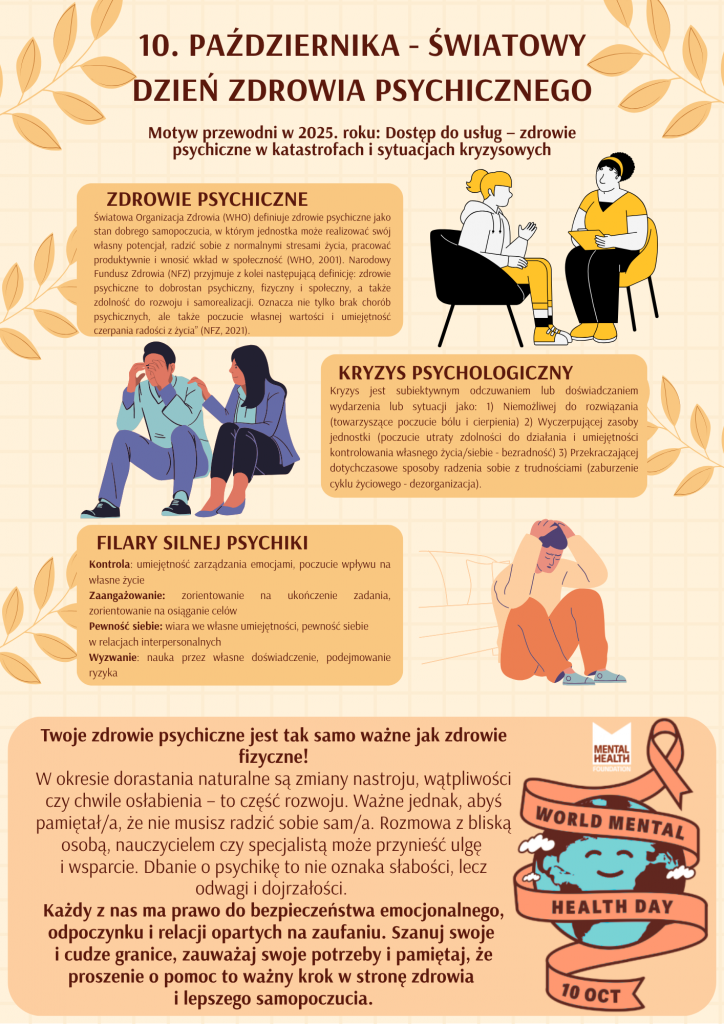 10. października obchodzimy Światowy Dzień Zdrowia Psychicznego – święto ustanowione, by zwrócić uwagę na znaczenie zdrowia psychicznego oraz promować działania wspierające dobrostan psychiczny. Tegoroczne hasło obchodów przypomina, jak ważne jest wspólne budowanie środowiska, w którym każdy może czuć się bezpiecznie, zrozumiany i wysłuchany.