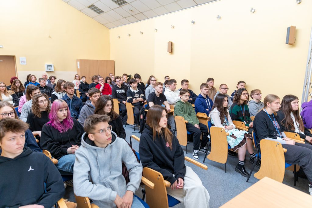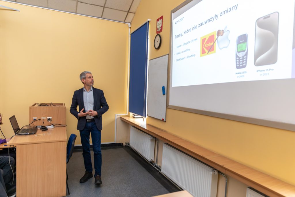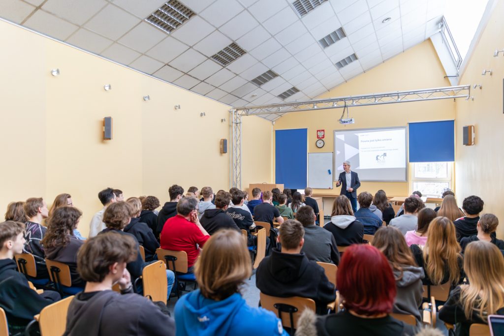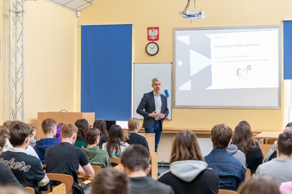 Podczas spotkania uczniowie mogli spojrzeć na swoją przyszłość z zupełnie innej perspektywy. Prelegent podkreślił, że dziś jedyną pewną rzeczą jest zmiana, a niepewność to naturalny element współczesnego świata. W tym kontekście przywołane zostały przykłady firm, takich jak Kodak, Nokia czy Blockbuster, które nie zauważyły zmian i nie potrafiły się do nich dostosować. Szczególnie ważnym wątkiem było podejście do planowania przyszłości. Zamiast wybierać jeden konkretny zawód, uczniowie zostali zachęceni do tego, aby budować swój zestaw kompetencji, który pozwoli im odnaleźć się w różnych sytuacjach i branżach. Podkreślono znaczenie połączenia odporności psychicznej z kompetencjami zawodowymi. Wśród najważniejszych umiejętności przyszłości wskazano tzw. „supermoce”: krytyczne myślenie, umiejętność łączenia faktów oraz zdolność adaptacji. Zwrócono również uwagę, że w erze sztucznej inteligencji coraz większe znaczenie będą miały relacje międzyludzkie, empatia i współpraca. Nie zabrakło także ważnego przesłania dotyczącego technologii: AI nie zastąpi ludzi, ale ludzie, którzy potrafią z niej korzystać, mogą zastąpić tych, którzy tego nie robią. Jednocześnie uczniowie zostali uwrażliwieni na zagrożenia w internecie, takie jak manipulacje czy fałszywe treści. Na zakończenie wykładu pojawiło się zachęcenie do działania: podejmowania inicjatywy już teraz. Prelegent podkreślił, jak ważne są małe projekty, udział w konkursach, budowanie własnego portfolio oraz współpraca z innymi, które pozwalają zdobywać doświadczenie i rozwijać swoje pasje.