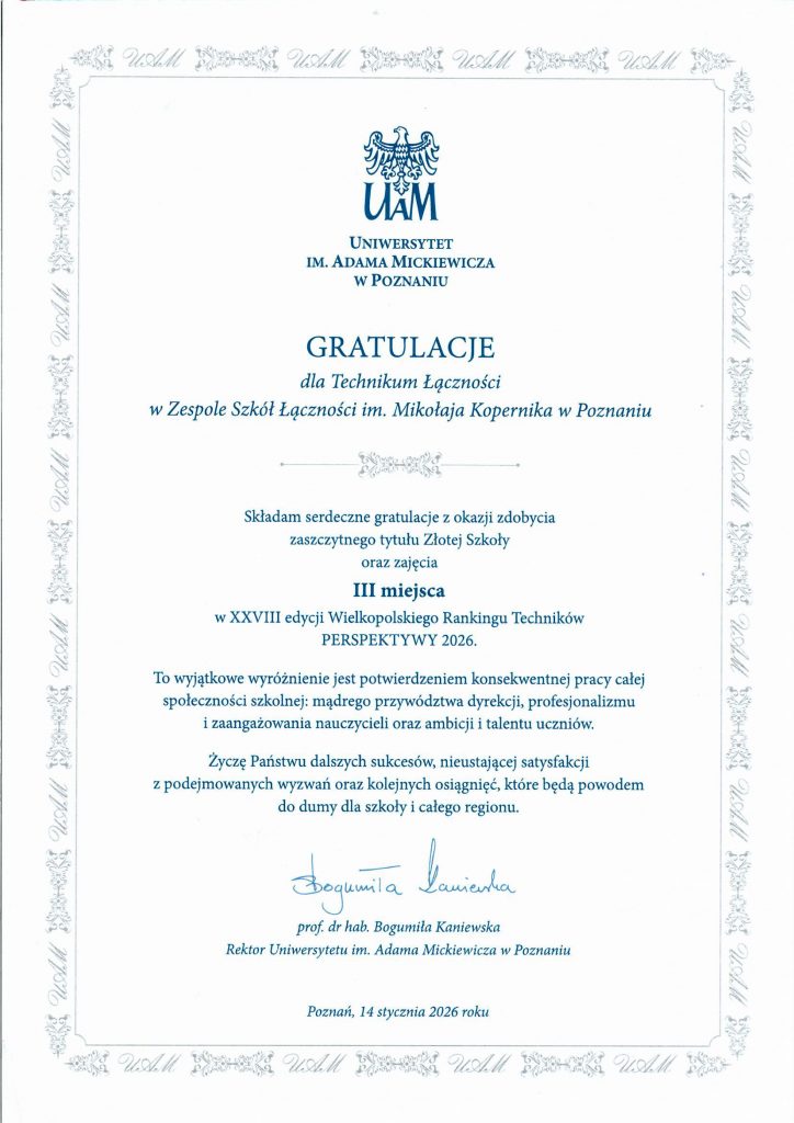 Technikum Łączności w Poznaniu zajęło 3 miejsce w województwie wielkopolskim oraz 14 miejsce w Polsce.